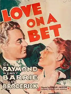 Love on a Bet is a 1936 American romantic comedy film directed by Leigh Jason using a screenplay by P. J. Wolfson and Philip G. Epstein, based on a story by Kenneth Earl. The film stars Gene Raymond, Wendy Barrie, and Helen Broderick, and was released by RKO Radio Pictures on February 1, 1936.