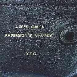 "Love on a Farmboy's Wages" is a song written by Andy Partridge of the English rock band XTC, released as the third single from their 1983 album Mummer. It peaked at number 50 on the UK Singles Chart. Partridge wrote the song during the aftermath of the cancelled English Settlement tour. It features a key modulation from E to F# before its bridge. Drummer Terry Chambers left the band during rehearsals for the song. The single's cover art is a photograph of Partridge's actual wallet with the title embossed.[3]