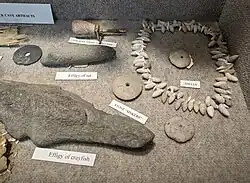 The most renowned discovery at Lovelock Cave was a cache of eleven duck decoys M.R. Harrington and L.L. Loud found when they were digging for the Museum of the American Indian in 1924 in Pit 12, Lot 4.[3] The cache included eight painted and feathered decoys and three unfinished decoys. Items found in the same pit consisted of feathers and two bundles of animal traps. The remarkable decoys were made from bundled tule, a long grass-like herb, covered in feathers and painted.[5]