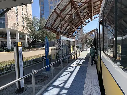 As part of DART's Station Art & Design Program, DART installed tile mosaics depicting bois d'arc trees and ten windscreens featuring poems by local poet Robert Trammell.[6][7][8] The station opened on January 10, 1997 alongside Mockingbird and Park Lane stations.[2]