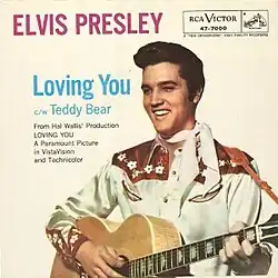 "Loving You" is a song written by Jerry Leiber and Mike Stoller and performed by Elvis Presley with backup vocals provided by the Jordanaires. It reached No. 15 on the U.S. country chart, #20 on the U.S. pop chart, and #24 on the UK Singles Chart in 1957.[1] It was featured on his 1957 album Loving You.[2] It was featured in Presley's 1957 movie Loving You. The single's A-side, "(Let Me Be Your) Teddy Bear" reached No. 1 on the U.S. pop, country, and R&B charts and #3 on the UK Singles Chart in 1957.[3]
