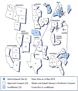 In response to the complex disposal issue, Congress passed the Low Level Radioactive Waste Policy Act of 1980 (P.L. 96-573), which established that each state was responsible for disposing LLRW generated within its boundaries.[5] Congress asserted that LLRW could be most safely and efficiently managed on a regional basis. The Act goes on to say that the states may enter into compacts with their neighbors under Congressional authorization. The law called for the ability of compacts to exclude wastes from other regions after January 1, 1986. The legislation led to the formation of a number of compacts, including the Appalachian, Central Midwest, Central States, Midwest, Northeast, Northwest, Rocky Mountain, Southeast, and Western. Certain states, notably California and Texas, chose to remain independent at the time. Compacts are responsible for deciding what facilities are needed and which state will serve as host and or how long.[6]