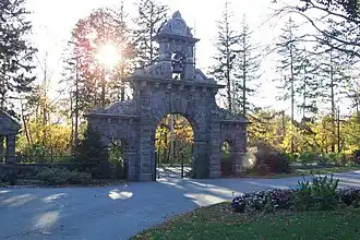 The cemetery is located in the central eastern part of the city, roughly bounded on the north by Fort Hill Park, on the east by Shedd Park, on the south by railroad tracks, and on the west by the Concord River, from which it is separated by Lawrence Street, where its historic main gate is located. It occupies 84 acres of rolling terrain, much of which has been developed. The main gate is a monumental granite structure designed by C. W. Painter and built in 1862. There is a secondary gate on Knapp Avenue at the cemetery's northeast corner, which was added in 1905. There are two buildings in the cemetery: the Talbot Memorial Chapel (1885) and the Superintendent's Office (1887), both Gothic Revival structures designed by Boston architect Frederick Stickney.[2]