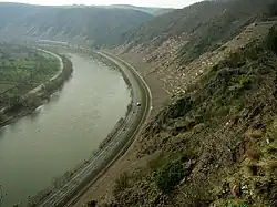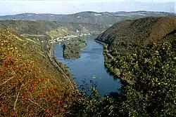 The Lower Moselle (German: Untermosel or Terrassenmosel) is the name given to the lower reaches of the Moselle river - just under 100 kilometres long - in Germany between Pünderich and the Moselle's confluence with the Rhine at Koblenz. The Lower Moselle landscape differs from that of the Middle and Upper Moselle, much of it forming a narrower valley with high and steep sides in places. On the cut banks of the river that are oriented towards the south and west, vineyards are managed, often on the tiniest, terraced strips of land on steep hillslopes.