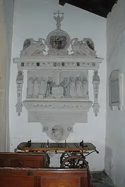 High on the east wall of the west tower is a small stone relief of a man[6][9] under a hood mould. On the north wall of the north aisle is a 14th-century painting of Saint Christopher carrying Jesus.[6][9] On the west wall of the north aisle is a monument to Sir Thomas Kirton (died 1601) and his wife Margaret (died 1597).[6][9] The church is a Grade I listed building.[9]