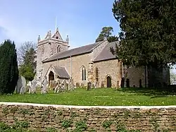 The present Church of England parish church of Saint John the Baptist, built of local ironstone, dates largely from the early part of the 14th century.[6][9] The north aisle has Decorated Gothic windows and an arcade of three bays.[6] The chancel has windows dating from about 1300, the middle of the Decorated Gothic period.[6] The chancel was restored in 1872 under the direction of the architect Albert Hartshorne.[6][9]