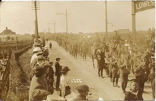 ![]() The 4th Battalion Suffolk Regiment marching from Lowestoft North to its camp along the Yarmouth Road; the tram standards and rails of Lowestoft Corporation Tramways can be seen. | |||||