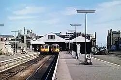 Dieselisation was gradually implemented in Suffolk from the 1950s onwards.[77][78] It began in 1954 when many steam engines were withdrawn from the Lowestoft area, followed in 1955 by the introduction of the two and four car diesel railcar units for the short services.[33] After June 1960, the East Suffolk line was only served by diesel trains.[62] The last recorded steam hauled passenger train left the station in June 1962, although for a number of years afterwards Class B1s were allocated to Lowestoft during the winter months to provide steam heating for hauled stock prior to departure behind diesel locomotives.[79][80][33] The next steam-hauled passenger train at the station was not until 4 May 2002 when BR Standard Class 4 2-6-0 No. 76079 headed 'The Easterling' from Liverpool Street via Norwich.[81] By the early 1960s, steam engines had almost disappeared from Lowestoft and in September 1962 the engine sheds and turntable finally closed.[80][82][83] Long distance through services were also cut down with the loss of the through trains to Birmingham and York in late 1964 on the basis that Lowestoft did not have sufficient facilities for the storage and cleaning of coaches.[33] The closure of the line between Lowestoft and Yarmouth South Town in 1970 saw the removal of the rails into platform 1. This section of the trackbed, as well as the siding which ran alongside, now forms part of the station car park.[84]