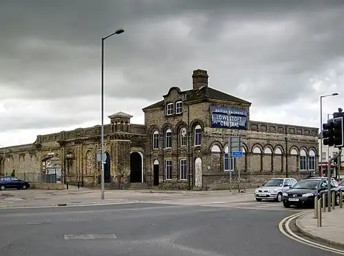 Lowestoft station opened on 1 July 1847.[16][17] At the time of construction, the station was separated from the town on the clifftop by about ½-mile of green fields and farmland, although a new turnpike road (now known as London Road North) linked it to Lowestoft.[18] Development was stimulated by the construction of the harbour later in 1847 and extension of the railway to a new fish market and cattle sheds.[18] Initially, only two platforms were provided, but rebuilding took place in 1855 by Lucas Brothers when a more substantial and well-designed building was provided.[19][20] The Italianate station is a fine example of their work, which also includes buildings such as the Royal Albert Hall, Liverpool Street station, York station and the Felixstowe Railway.[13] In 1855, the station's roof burnt down and timber for the new roof was brought in from Scandinavia by Peto's North of Europe Steam Navigation Company.[18] The main buildings were arranged in an L-shaped configuration, with the booking, enquiry and parcels offices laid out on the north side bordering Denmark Road, the refreshment rooms were on the east side opening into Station Square and the toilets and bookstall were to the south.[19] The concourse was covered by an overall roof which extended some way over the tracks and platforms to provide a small train shed.[19][21]