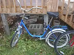 A lowrider bicycle is a highly customized bicycle with styling inspired by lowrider cars.[1] These bikes often feature a long, curved banana seat with a sissy bar and very tall upward-swept ape hanger handlebars. A lot of chrome, velvet, and overspoked wheels are common accessories to these custom bicycles.[1]