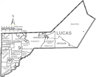 Lucas County is a county located in the northwestern part of the U.S. state of Ohio. It is bordered to the east by Lake Erie, and to the southeast by the Maumee River, which runs to the lake. As of the 2020 census, the population was 431,279.[2] Its county seat and largest city is Toledo, located at the mouth of the Maumee River on the lake.[3] The county was named for Robert Lucas, 12th governor of Ohio, in 1835 during his second term.[4] Its establishment provoked the Toledo War conflict with the Michigan Territory, which claimed some of its area. Lucas County is the central county of the Toledo Metropolitan Statistical Area.