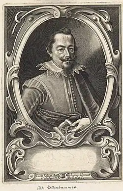 Kilian was born in Augsburg, the son of Silesian goldsmith Bartholomaus Kilian the elder and Maria Pfeiffelmann. After his father's death in 1588, his mother remarried Dominicus Custos and he and his brother Wolfgang became his pupils.[1] He also trained in Venice from 1601 to 1604 under Hendrick Goltzius and worked briefly in the printing shop of Giusto Sadeler. He returned to Augsburg to work with Wolfgang following the death of his step father. He specialized in portraits, mythology and ornaments. Kilian's engraved portrait of Albrecht Dürer, based on a Dürer self-portrait from a copy of Dürer's Feast of the Rosary by Johann Rottenhammer, "became one of the best-known representations of Dürer to posterity."[2] He is also known for his engravings after Cornelis Cornelisz. van Haarlem.[1] His anatomy broadsides, Catoptri Microcosmici ('Mirrors of the Microcosm'), produced after designs by the medical doctor Johannes Remmelin and published by Stephan Michelspacher, were much reprinted after their original publication in 1613, including a 1615 pamphlet, a 1619 book, reprints in German, Latin, Dutch and English, as well as a 1754 Italian plagiarism.[3] Another famous work was a detailed bird's eye view cityscape of Augsburg produced in 1626. Lucas and Wolfgang had prominent patrons in Philipp Hainhofer and the Fugger family. Nearly 1050 works have been identified as being made by Lucas. Lucas married Barbara Miller (d. 1620) in 1604 and died in Augsburg in 1637. The family business declined following the Thirty Years War but the next generation, led by Wolfgang's sons Bartholomäus and Philipp Kilian who trained in France and Italy became book illustrators in the baroque style.[4]