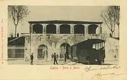 The Lucca–Ponte a Moriano line was inaugurated in 1883, with the initial southern terminus located outside the city walls at Porta Santa Maria.[7] In June 1884 the line was extended closer to the existing Lucca railway station, despite resistance from some who opposed the opening of a passage for the tram through the ancient walls of Lucca.[8] Trams were routed through the city along via dei Borghi and via dei Bacchettoni before exiting the city walls via a specially constructed[9] short tunnel subsequently called sortita Cairoli, until reaching the new terminus station of Porta San Pietro located in the square in front of the railway station.[10][11]