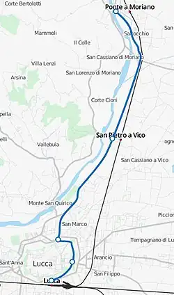 The Lucca–Ponte a Moriano Tramway (Italian: Tranvia Lucca-Ponte a Moriano) was an urban steam tramway line that connected Lucca railway station with a renowned[1] jute factory in Ponte a Moriano.[2] The line was closed in 1932[3] and ran almost parallel to the Lucca–Aulla railway.[4]