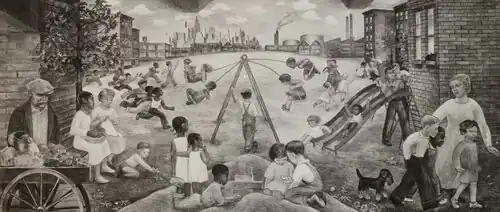 The mural for the House of Detention for Women commissioned by the Federal Arts Project was entitled The Cycle of a Woman's Life. It was planned to cover three wall of the 12th-floor recreation room, but only one wall was completed.[8][9]