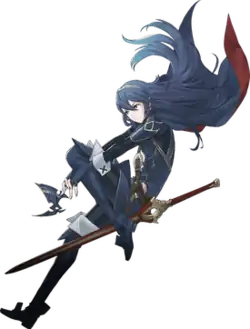 Lucina later appeared in Awakening's follow up, Fire Emblem Fates, though only as an additional downloadable content (DLC) character, not a core character to the game's story.[7] She is also a playable character in Nintendo's mobile entry in the series, Fire Emblem Heroes,[8] and Fire Emblem Warriors, a Tecmo Koei developed musou action game spin-off.[9] Tecmo Koei originally wanted to drop her from the game's story, citing both issues with her time-travelling backstory conflicting with the new story they were trying to tell in the game, and the perception that there were already too many sword-bearing characters unbalancing the game's gameplay.[10] This idea was rejected by Intelligent Systems and Nintendo, deeming her too important to the franchise to be cut from the game.[10] In Fire Emblem Engage, Lucina appears as an Emblem Ring (guest character) alongside other past Fire Emblem protagonists.[11]