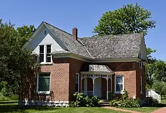 The Lucius and Maria Clinton Lane House, also known as the Carrie Lane Chapman Catt Family Home, is a historic building located west of Charles City, Iowa, United States. It was listed on the National Register of Historic Places in 1998.[1] The 1½-story, Late Victorian hollow brick structure was built in 1866 by Lucius Lane. The west wing may predate the rest of the house, being the log cabin that existed on the property when Lane bought it.[2] When building this house, it is possible that Lane was influenced by A. J. Downing's work, The Architecture of Country Houses (1850), which describes hollow brick wall construction, and Woodward's Country Homes (1865), which features a nearly identical floor plan to this house.