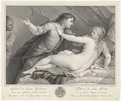 There is a quite different picture in the storage of the Louvre, catalogued as Lucretia and Tarquin (French: Lucrèce et Tarquin), dated to the first quarter of the 17th century and attributed to the workshop of Giordano.[6] This picture was once part of the art collection of Louis La Caze (1798–1869), which he bequeathed to the Louvre.[6] Another picture by Luca Giordano on this subject is in a private collection.[7]