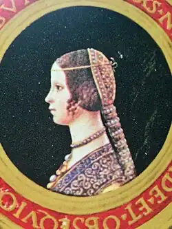 Crivelli was a lady-in-waiting to Ludovico Sforza's wife, Beatrice d'Este (29 June 1475 – 2 January 1497). During this time, she also became the mistress of Sforza. In 1497, she gave birth to his son, Giovanni Paolo.[1] Sforza's affair with Crivelli caused much distress to his wife, who was considered accomplished and cultured. Upon learning of the affair, d'Este tried without success to have Crivelli banished from court. However, after Beatrice's death in 1497, Lucrezia returned to court and bore Sforza a second child in 1500.[1]