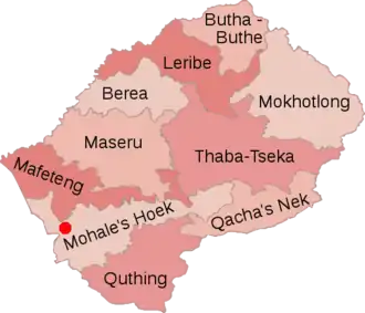 The Mants'ase Children's Home was started in 1979 as home for unwanted girls by Father Patrick M. Maekane, a retired Anglican priest and founder of the Mophato oa Mants'ase Society. After the initial buildings have been built by local women the first child was admitted in February 1980.[38][39] The Home is located in Qhalasi in the Mohale's Hoek district of the Kingdom of Lesotho.