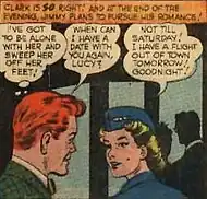 In the Silver Age stories, Lucy was presented as an airline stewardess who was an on-again, off-again romantic interest of Jimmy Olsen. Lucy's Silver Age appearances often revolved around Jimmy's various attempts at romancing her. A wedding took place in Superman's Pal, Jimmy Olsen issue #100 (March 1967) which was intended to be a permanent change to the comic's status quo, but editor Mort Weisinger changed his mind at the last minute, and had writer Leo Dorfman change the ending to include a sudden annulment of the marriage.[6]