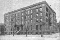 The building faced 130 feet (40 m) on North Capitol Street, and was 80 feet (24 m) deep on the M Street front.[2] Rust Hall was a five-story structure. It contained 115 rooms, of which 15 were for public use. The building accommodated 100 people and provided modern appliances. It was heated by hot water and lit by electricity generated by its own engines and dynamos. It was furnished with elevator and iron stairways. A telephone system connected the institution with the main office. Henrietta A. Bancroft served as chairman of the building committee. Charles W. Gallagher was treasurer and president of the National training school when the building opened.[3]