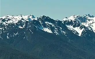 The Olympic Mountains are composed of obducted clastic wedge material and oceanic crust, primarily Eocene sandstone, turbidite, and basaltic oceanic crust.[10] The mountains were sculpted during the Pleistocene era by erosion and glaciers advancing and retreating multiple times. Ludden Peak is composed of hardened metaconglomerate.