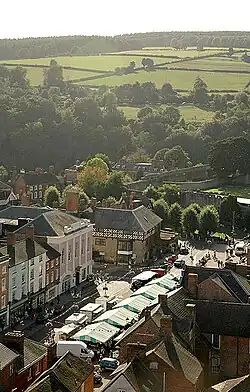 The historic centre of Ludlow has largely escaped development that would otherwise alter its medieval, Tudor and Georgian character. Furthermore, the lack of development to the south and west allows for the town's historic setting (and particularly that of the castle) by the Teme and the neighbouring countryside to be readily appreciated in the modern day. M.R.G. Conzen remarked of Ludlow "Its composite medieval town plan and a history of eight and a half centuries with several periods of considerable importance have endowed its Old Town with an historically well-stratified and richly textured landscape."[62] Michael Raven, who created a detailed gazetteer of all the settlements of Herefordshire and Shropshire in the late 20th century, stated that "There can be little doubt that Ludlow is the finest town in Shropshire."[63]
