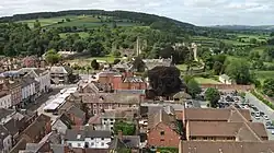 The oldest part is the medieval walled town, founded in the late 11th century after the Norman conquest of England. It is centred on a small hill which lies on the eastern bank of a bend of the River Teme. Situated on this hill are Ludlow Castle and the parish church, St Laurence's, the largest in the county.[2] From there the streets slope downward to the rivers Corve and Teme, to the north and south respectively. The town is in a sheltered spot beneath Mortimer Forest and the Clee Hills, which are clearly visible from the town.[3]