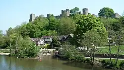 Lodelowe was in use for this site before 1138 and comes from the Old English "hlud-hlǣw".[10][11] At the time this section of the River Teme contained rapids, and so the hlud of Ludlow came from "the loud waters", while hlǣw meant "hill"[10] or tumulus.[12] Thus the name Ludlow describes a place on a hill by the loud waters. Some time around the 12th century, weirs were added along the river, taming these rapid flows.[13] The hill is that which the town stands on, and a pre-historic burial mound (or barrow) which existed at the eastern summit of the hill (dug up during the expansion of St Laurence's church in 1199) could explain the tumulus variation of the hlǣw element.[11][14] Ludford, a neighbouring and older settlement, situated on the southern bank of the Teme, shares the hlud ("loud waters") element.[14]