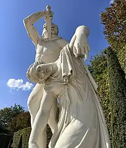 The sculpture, in the Museo Nazionale di Roma, Palazzo Altemps, Rome, was greatly admired from the 17th century. It appeared in engravings in therepertory of sculpture in Rome by Perrier[6] and was codified by Audran[7] as one of the sculptures of Antiquity that defined the canon of fine proportions of the human body. Nicolas Poussin adapted the figure for the group in the right foreground of his Rape of the Sabine Women at the Metropolitan Museum of Art (Friedlaender 19 and fig. 108). Visitors and writers of guidebooks found many subjects drawn from Roman history to account for the action: the 1633 Ludovisi inventory lists it as "a certain Marius who kills his daughter and himself",[8] drawing upon the story of a certain patrician Sextus Marius, who in seeking to protect his daughter from the lust of Tiberius, was accused of incest with her.