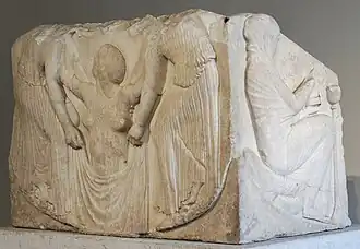 The iconography of the subject is without a parallel in Antiquity, thus the very subject of the relief is in doubt. Alternative views, since the flanking attendants stand on pebbled ground, have been offered: that the emerging figure is that of the ritual robing of a chthonic goddess, probably Persephone, rising from a cleft in the earth[3] (Pandora is similarly shown in Attic vase-paintings) or of Hera emerging reborn from the waters of Kanathos near Tiryns as Hera Parthenos.[4]
