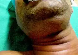 Swelling in the submandibular area in a person with Ludwig's angina.