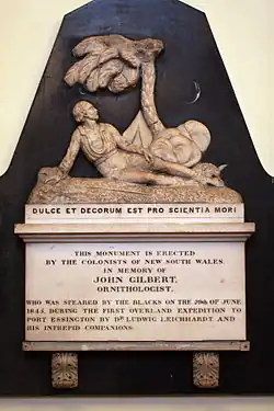 A memorial to John Gilbert, one of Leichhardt's companions on this journey, can be found on the north wall of St James' Church, Sydney. Under the title Dulce et Decorum Est Pro Scientia Mori (a variation on the more commonly seen Dulce et decorum est pro patria mori) the inscription on the monument, which was "erected by the colonists of New South Wales" reads: "in memory of John Gilbert, Ornithologist, who was speared by the blacks on 29 June 1845 during the first overland expedition to Port Essington by Dr Ludwig Leichhardt and his intrepid companions". There is also a memorial to Gilbert at Gilbert's Lookout at Taroom.[11]