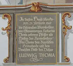 Ludwig Thoma was born as the fifth child of forester Max Thoma and his wife Katharina Thoma, née Pfeiffer, in Oberammergau. His paternal ancestors were active in the forest service; his great-grandfather Joseph von Thoma (1767–1849) had headed the Bavarian Forestry Commission and had been elevated to the nobility as a life peer for his services.[3][4] His mother's family initially ran an inn in Oberau, later in Oberammergau.[5] He spent the first years of his life in the forester's lodge of Vorderriß on the River Isar near the Tyrolean border, a very remote and lonely area at the time. His upbringing was essentially in the hands of his nanny Viktoria Pröbstl, with whom Ludwig Thoma had a very close relationship.[6]