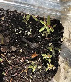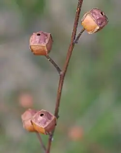 Flowers are usually single, growing from the leaf axils on upper leaves. They have four yellow petals and four light green sepals.[9] The mature fruits are brown, cubic capsules with rigid sides, about 0.25 in (0.6 cm) in length.[8]