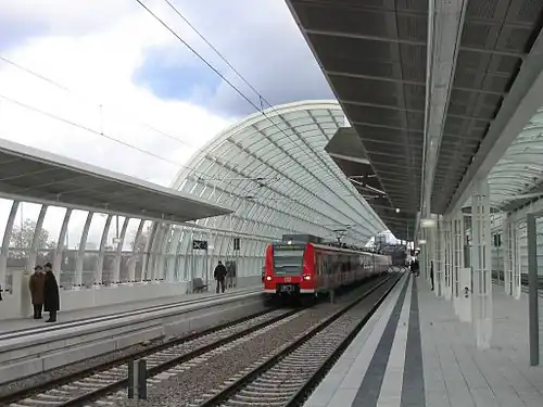 The station has a side platform (platform track 1) and a central platform (tracks 2 and 3). The platforms for most of their length are covered by a glass roof and the building is full of light. In 2004, the station received the Renault Traffic Design Award, an architecture prize. A fourth track runs through the station on its southern side without access to a platform. This track is primarily used for freight trains passing through the station.