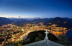 The local Lombard form of the name is rendered Lugan.[12] The etymology of the name is uncertain, suggestions include derivation from Latin lucus ("grove"),[13] from a Vulgar Latin *lakvannus ("lake-dweller")[14] and from the god Lugus.[15] In Romansch, especially in traditional Sursilvan dialect, the city is known as Ligiaun.