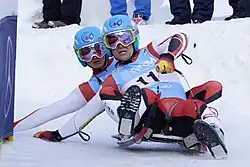 A luge (/luːʒ/) is a small one- or two-person sled on which one sleds supine (face-up) and feet-first. A luger begins seated, propelling themselves initially from handles on either side of the start ramp, then steers by using the calf muscles to flex the sled's runners or by exerting opposite shoulder pressure to the pod. Racing sleds weigh 21–25 kg (46–55 lb) for singles and 25–30 kg (55–66 lb) for doubles.[1] Luge is also the name of an Olympic sport that employs that sled and technique.