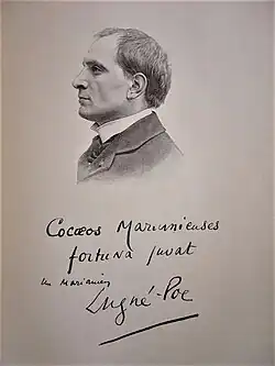 In 1887, at age 17, Lugné-Poe and friend Georges Bourdon created an amateur theatre group called le Cercle des Escholiers, which sought to perform "unpublished or, at the very least, little-known works."[6] As he prepared to audition for the Paris Conservatory, he changed his name from Lugné to "Lugné-Poe" in homage to Edgar Allan Poe.[7] While the Conservatory rejected his audition in fall 1887, they accepted him in fall 1888; days later he joined André Antoine's Théâtre Libre, a subscriber-based Naturalist independent theatre.[8] After appearing in the first play of that season under his own name, Lugné-Poe adopted the stage names "Philippon," "Delorme," and "Leroy" for the duration of his association with Antoine's company.[9]