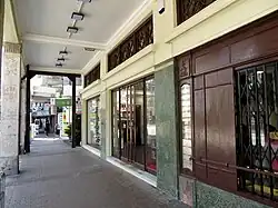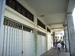 The structural system for Lui Seng Chun consists of reinforced concrete shallow pad foundations supporting granite columns with reinforced concrete beams, floors and walls.[1] Its architecture reflects the Neoclassical style which is characterised by a square-shaped frame and a row of decorative balustrades in front. The deep verandahs were added to prevent rain from flooding the house, block sunlight and keep the indoor area cool. This, together with the stone plaque marked with the name of the medicine shop installed at the top of the building, is typical of pre-war Chinese tenements. The main facade of the building was decorated with ornate classical Italianate designs, one of which is the broken pediment at the shop. The curved front elevation was designed to make better use of the narrow strip of land restricted by the road junction. Structurally, the external walls of the building are made of plastered red brickwork with columns and beams of reinforced concrete.