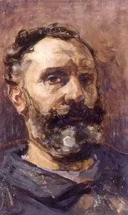 In Florence, he was a companion of Raffaele Faccioli, with whom he shared an award in 1866. The last years of his scholarship (1869-1870) led him to move to Rome. In Florence, he had befriended the circle of Macchiaioli painters who frequented the Caffè Michelangiolo; yet, unlike those painters, Serra practiced in a Purismo style recalling Quattrocento painters like Francesco del Cossa, Andrea del Castagno, Verrocchio, and Pollaiolo.[1] In the early 1870s Serra joined a city council for education led by Giosue Carducci and Raffaele Belluzzi. Serra along with the lawyer Ulisse Sartori, represented the Societies of Artists and Fine Arts.