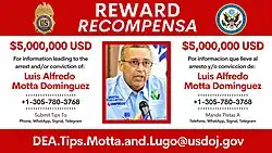 On 30 September 2020, the Drug Enforcement Administration (DEA) published a poster on its Twitter account offering up to US$5 million for information that could lead to the capture of Motta Domínguez.