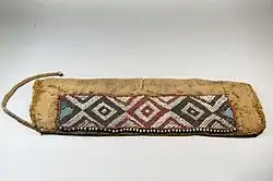 Lukasa memory boards are hourglass-shaped wooden tablets that are covered with multicolored beads, shells and bits of metal, or are incised or embossed with carved symbols.[1] The colors and configurations of beads or ideograms serve to stimulate the recollection of important people, places, things, relationships and events as court historians narrate the origins of Luba authority. A lukasa serves as an archive for the topographical and chronological mapping of political histories and other data sets.[2]