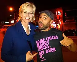 ![]() Luke Montgomery with actress Jane Lynch (left) pointing to his "Some Chicks Marry Chicks, Get Over It" T-shirt from his brand and videos. | |