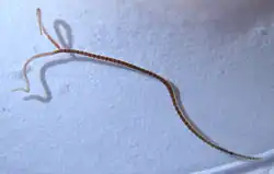 Lumbriculus variegatus, also known as the blackworm or California blackworm or Australian Blackworm, is a species of worm inhabiting North America, Europe, and Australia. It lives in shallow-water marshes, ponds, and swamps, feeding on microorganisms and organic material. The maximum length of a specimen is 10 cm (3.9 in). Worms raised in laboratory environment are slightly shorter, with 4 to 6 cm (1.6 to 2.4 in) long bodies. An adult individual has approximately 150 to 250 1.5 mm wide segments,[1] each of which has the ability to regenerate into a new individual when separated from the rest of the animal. In most populations, this is the primary mode of reproduction, and mature individuals are exceedingly rare; in large areas (including Asia, most of North America and the greater part of Europe) mature individuals have never been found. The name blackworm is given to at least three distinct species of worm that are identical in appearance and were once considered a single species.[2]