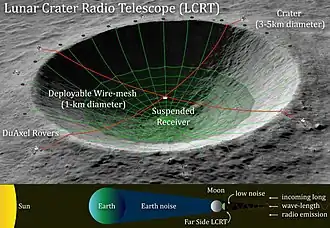 The Lunar Crater Radio Telescope (LCRT) is a proposal by the NASA Institute for Advanced Concepts (NIAC) to create an ultra-long-wavelength (that is, wavelengths greater than 10 m, corresponding to frequencies below 30 MHz) radio telescope inside a lunar crater on the far side of the Moon.[1][a]