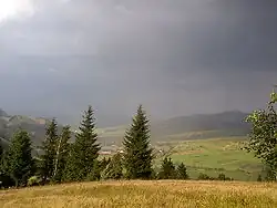 The village is the first of the three Csángó settlements as the Gyimes Valley (Valea Ghimeşului) descends from its head.