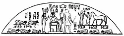The main body of the stele is then presented below, often separated with a horizontal line (register), but not always. In Egyptian steles, many have horizontal lines of hieroglyphs; often the lunette will contain shorter vertical statements in hieroglyphs, sometimes just names of the individuals portrayed, hieroglyphs in front, or behind the individual.