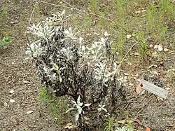 Lupinus guadalupensis is a rare species of lupine known by the common name Guadalupe Island lupine. It is known only from San Clemente Island, one of the Channel Islands of California, and Guadalupe Island off the coast of Baja California. It is a member of the coastal scrub growing alongside other island endemics and more common plants. This is an annual herb growing 20 to 60 centimeters high. Each palmate leaf is made up of 7 to 9 narrow leaflets up to 5 centimeters long and just a few millimeters wide, sometimes linear in shape. The inflorescence bears whorls of flowers each about a centimeter long and blue in color with a white banner patch which may fade pink. The fruit is a very hairy legume pod up to 6 centimeters long and about one wide. It contains 6 to 8 seeds.